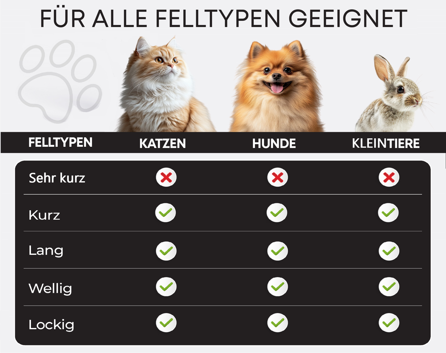 Ja, die NobelFell Fellbürste ist ideal für alle Felltypen, sowohl für kurze als auch für lange Haare. Die speziell entwickelten Borsten entfernen lose Haare und Verfilzungen sanft, ohne die Haut zu reizen – perfekt für Katzen und Hunde aller Größen und Rassen.
